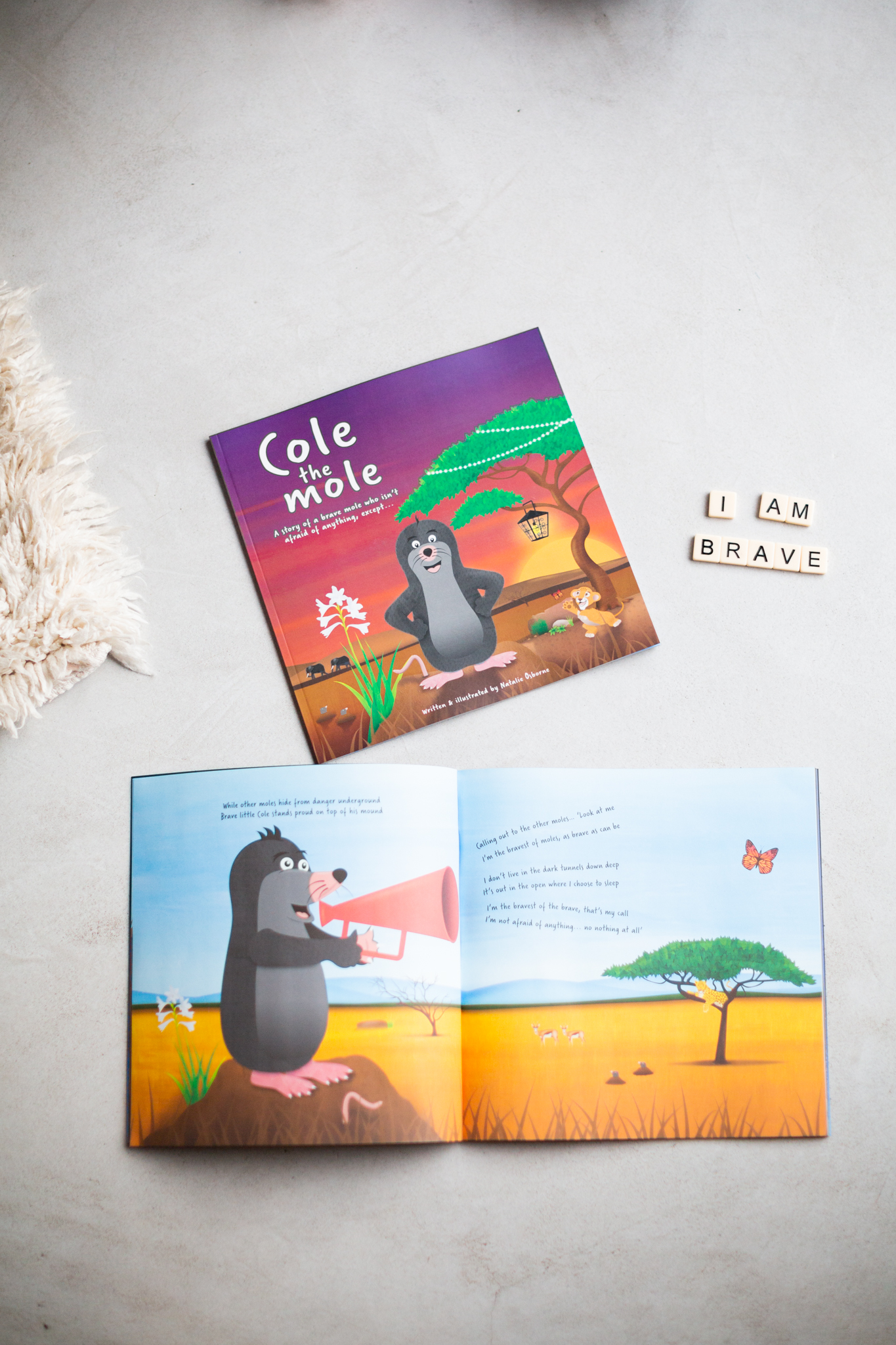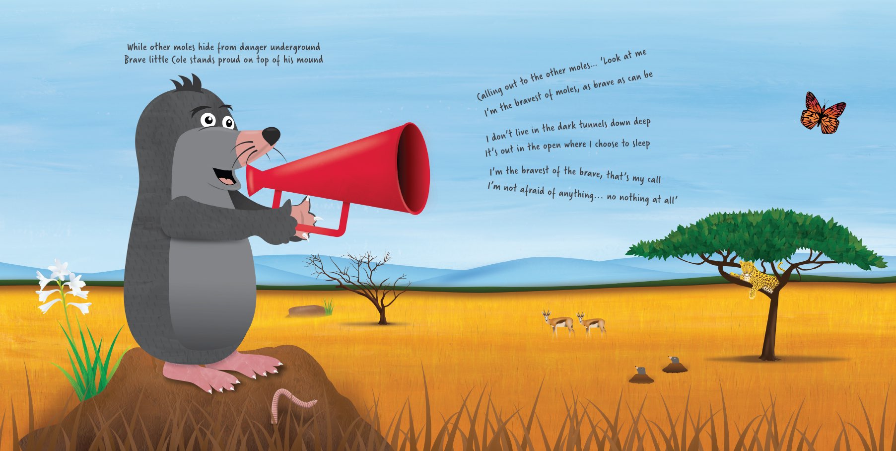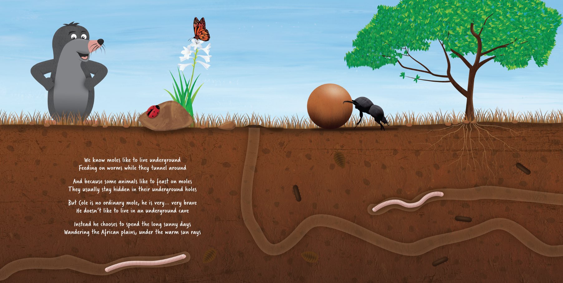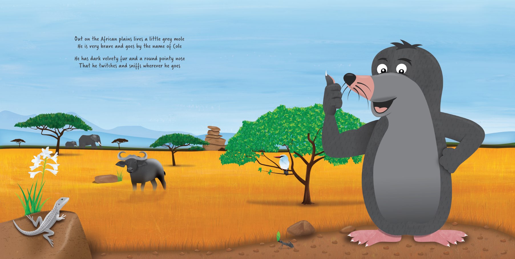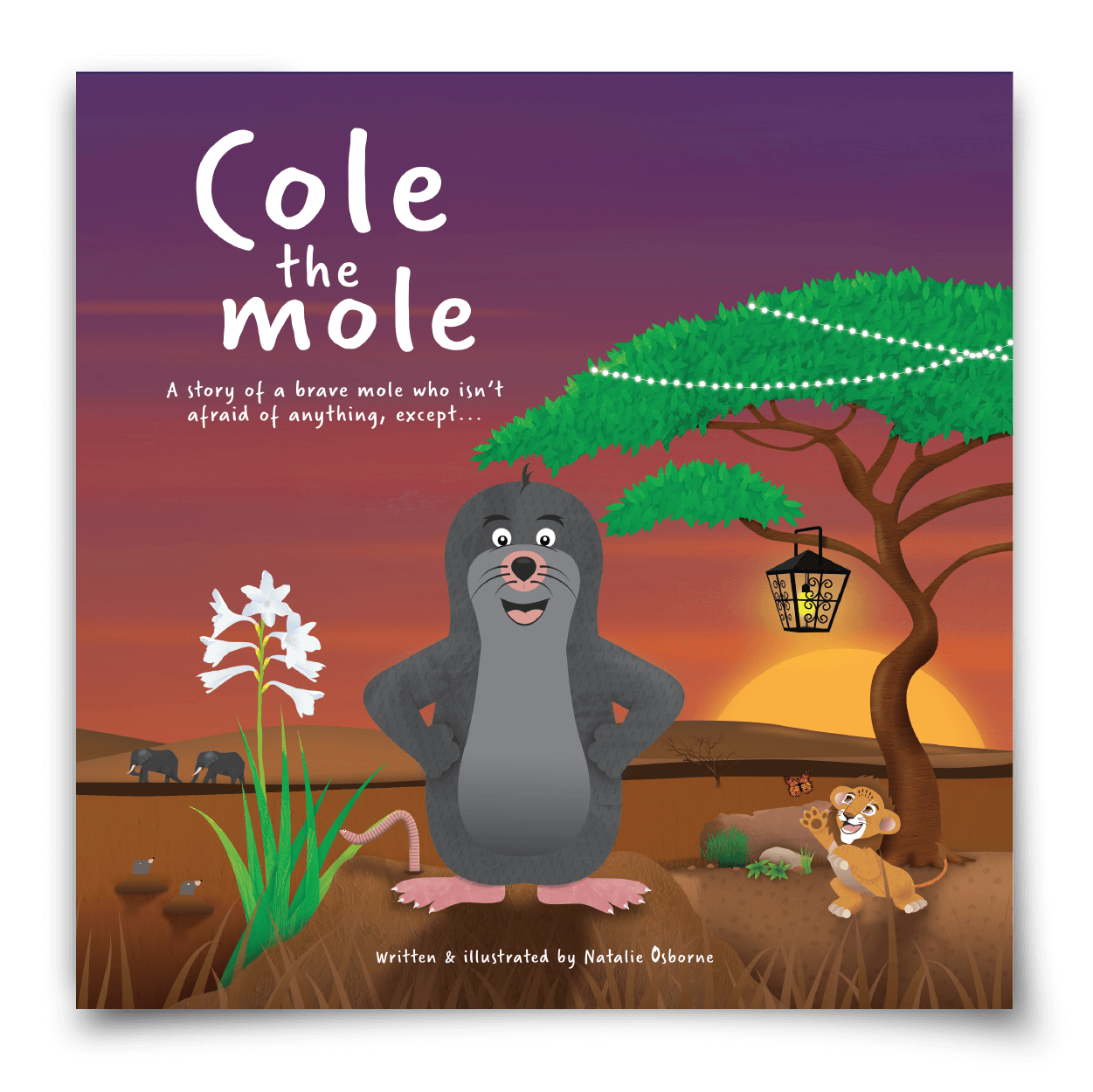 Cole the mole is a heart-warming children’s story which addresses the childhood fear of the dark. It is aimed at 2-8 year olds and is set in the African wilderness. Here a brave mole has to overcome his secret fear in order to help a young lion cub find his lost parents. This is a story of friendship between two unlikely characters as they set off on an exciting adventure into the wilderness. They have insightful encounters with other animals, that leads not only to the two friends finding the young cub’s parents, but also to Cole overcoming his one and only fear – the dark.